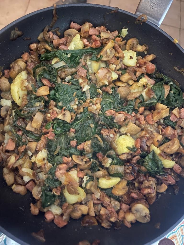 Tonight I wanted to try something new. The challenge was chicken as main protein, served with a base of spinach, mushroom and red onion, and I served it with oven roast veggies and a potato volcano!